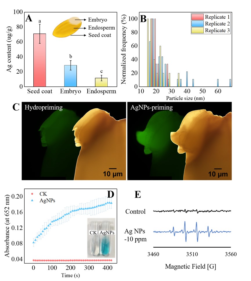 Figure 2. (A) Ag distribution in different tissues (seed coat, embryo, and endosperm) of rice seeds after priming with AgNPs for 24 h. (B) Size distribution of nanoparticulate Ag in rice seeds primed with AgNPs for 24 h. (C) Images of water- or AgNPs-primed rice seeds captured using fluorescence (left) and brightfield (right) microscopy. Primed rice seeds were stained with DCFH-DA for 30 min before microscopic observation. (D) POD-like activities of AgNPs. (E) EPR results showing the generation of hydroxyl radicals (OH•).