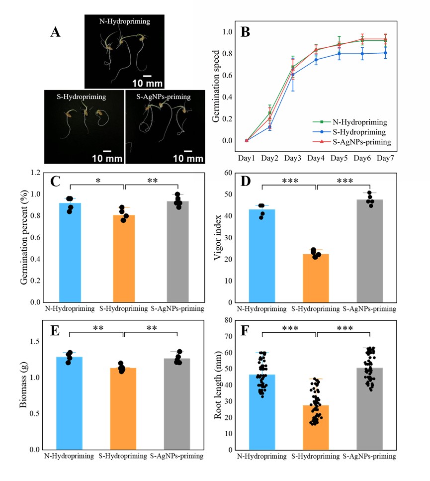 Actually, plants have evolved sophisticated defense systems to cope with diverse abiotic and biotic stresses. Under stress, a series of molecular events such as stress perception, signal transduction, transcriptome/metabolome changes occur in plants, and these molecular changes can be "remembered" by plants to respond faster and/or stronger in the face of stress in the future, the so-called "stress memory". Based on this, our team hypothesized that stimulating seeds at the germination stage, inducing stress memory, is likely to enhance the seedlings’ stress resistance. Reactive oxygen species (ROS) are important signaling molecules that can act as "danger" or "warning" signals to trigger immune responses. However, ROS are chemically unstable molecules with relatively short lifetimes. Nanozymes are nanomaterials with enzymatic properties. Our previous studies have shown that AgNPs can trigger ROS generation in algae/plants. Besides, the small size enables AgNPs to easily penetrate the biological barriers of the seed coat. As such, AgNPs could be a model nanobiostimulant to be used as seed treatment agent. Taking the staple crop rice as the test plant and salt as the representative of abiotic stress, our team explored the performance of AgNPs seed priming on seed germination under stress. The results showed that seeds primed with AgNPs (40 mg/L) for 24 h exhibited accelerated germination speed, significantly increased seedling vigor, biomass and root length compared to seeds with hydropriming treatment under stress. These results verified our hypothesis that AgNPs-priming can stimulate rice seeds to form stress memory and enhance salt tolerance. Importantly, this "stress memory" can last to the seedling stage, enhancing the resistance of 37-day-old rice seedlings to both salt and rice blast disease, indicating that seed defense-priming is able to increase the resistance of seedlings to abiotic and biotic stresses simultaneously (Figure 1).