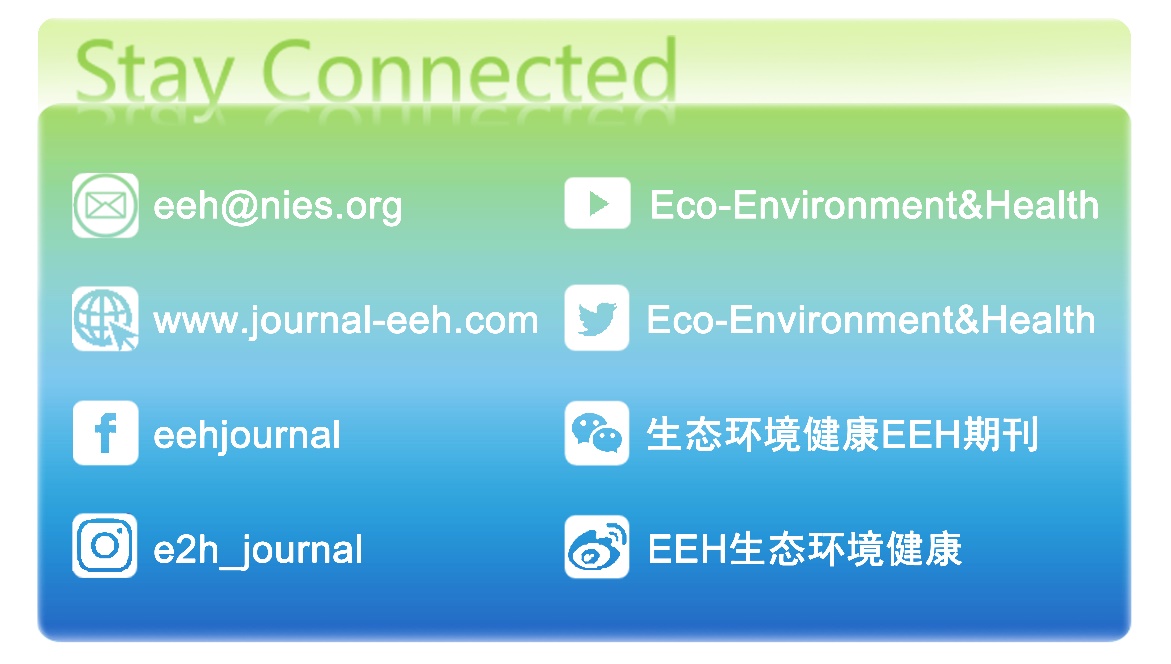 Eco-Environment & Health(EEH)期刊是由蜜糖直播 和生态环境部南京环境科学研究所共同创立的英文期刊,以期打造成为环境健康领域旗舰期刊。 EEH聚焦大健康(One Health)理念,助力绿色可持续发展,关注生态、环境与健康之间交互作用的过程、机制与干预,范畴包括生态安全、环境健康风险、生态与环境修复。重点方向为:生态与生物多样性保护,新污染物的环境归趋与生物过程,人体暴露与健康效应,环境风险评价、管理与调控。
