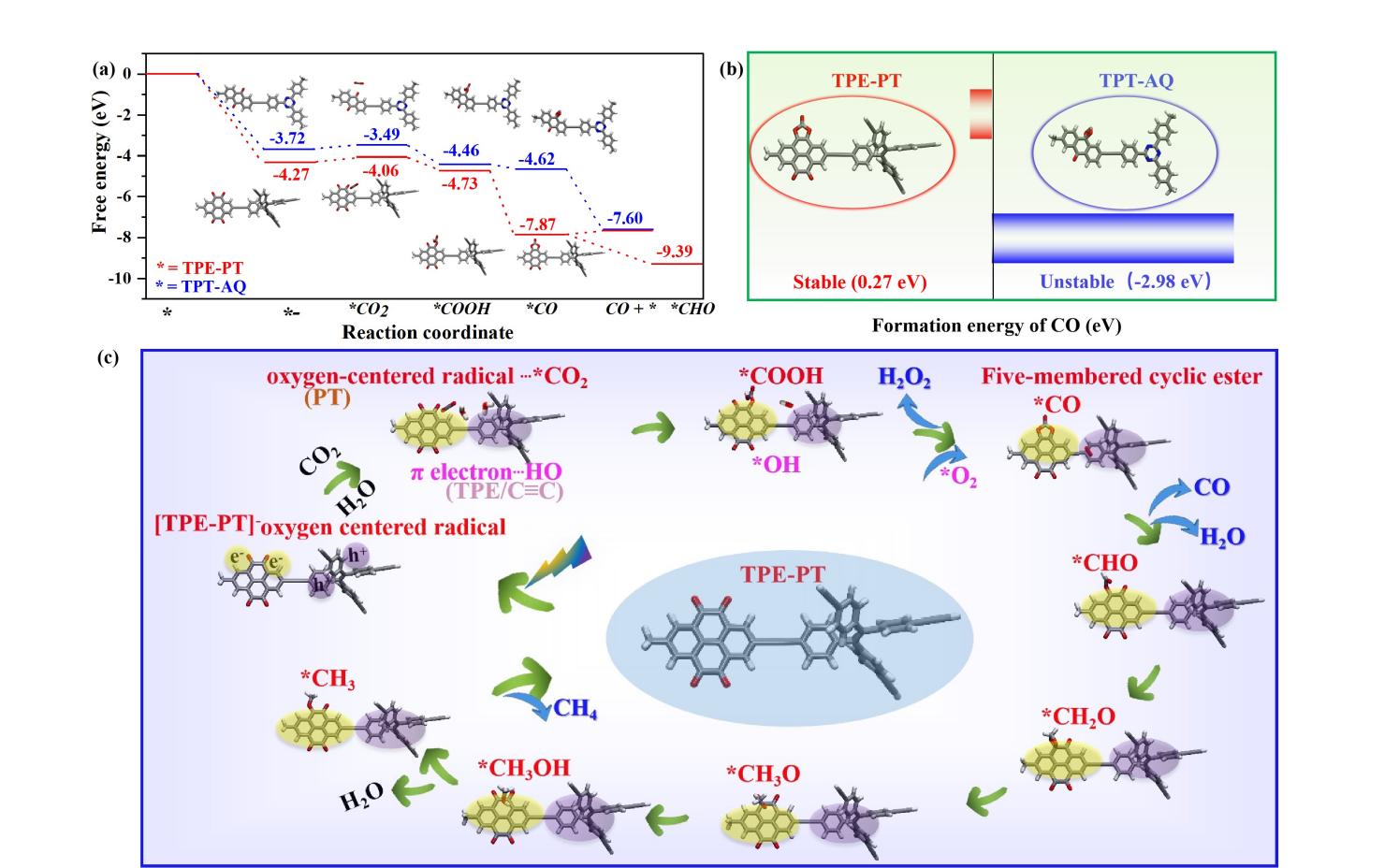 该工作开发了一种新型的长寿命有机自由基作为CO2还原成CH4的高选择活性位点。该聚合物中的电子受体芘- 4,5,9,10 -四酮(PT)在光激发下转化成长寿命的氧中心有机自由基。该自由基与CO2反应形成稳定的碳酸酯五元环,并进一步质子化还原生成CH4,从热力学上显著提高了CH4的生成。相反地,当以蒽醌(AQ)作为电子给体时,光激发后生成的有机自由基与CO2反应形成不稳定的四元环,促使CO的生成,无法生成CH4。