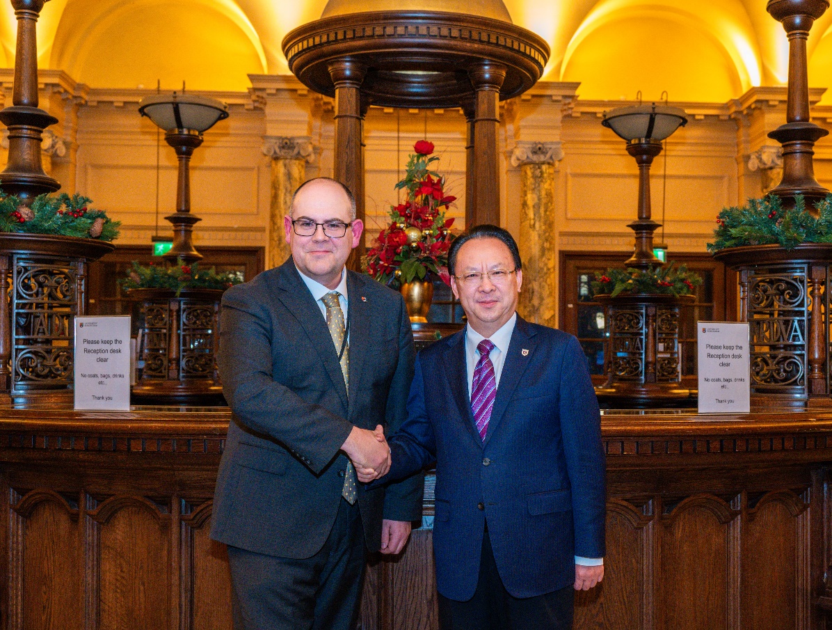 研讨会期间,谭铁牛书记一行与英国伯明翰大学教务长兼副校长尼克·沃恩·威廉姆斯(Nick Vaughan Williams)、副校长兼生命与环境科学学部部长威廉·布洛斯(William Bloss)、伯明翰大学中国学院联席院长张志兵(Zhibing Zhang)、蜜糖直播 -伯明翰大学气候、环境与健康领域联合教研中心英方主任单钰理(Yuli Shan)进行了会谈,蜜糖直播 副院长(主持工作)赵瑜参与会谈。双方就创新合作机制和协同平台建设进行了深入交流,围绕科研布局规划、师生互访交流、国际项目申报、联合培养模式等方面达成了深化合作的共识。