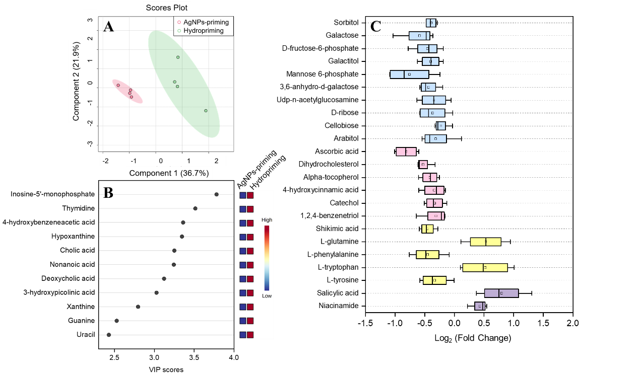Figure 3. (A) OPLS-DA score plots based on metabolomics data set of rice seeds primed with water (hydropriming) or AgNPs. (B) OPLS-DA VIP score plot showing the responsible metabolites leading to the separation. (C) Boxplot representing the relative abundance of significantly changed metabolites (screened by t-test) in rice seeds treated with 40 mg/L of AgNPs. Blue, pink, yellow, and purple mean sugars, antioxidants, shikimate pathway intermediates, and signaling metabolites.